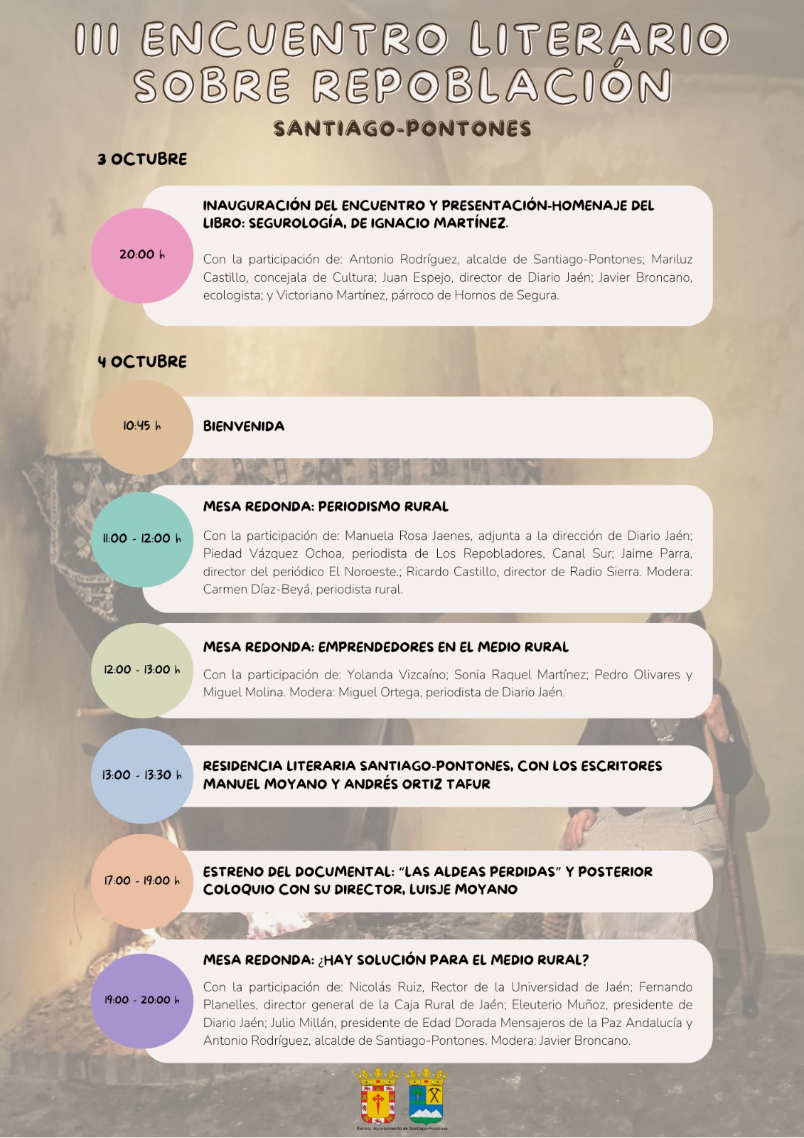 El Encuentro Literario de Repoblación Santiago-Pontones, lleva realizándose desde el año 2023 gracias a la implicación del ayuntamiento de la localidad. Desde su comienzo, ha contado con la presencia de Sergio del Molino, Joaquín Araujo o Pedro Trapiello, entre otros. La asistencia es abierta y totalmente gratuita durante los dos días.