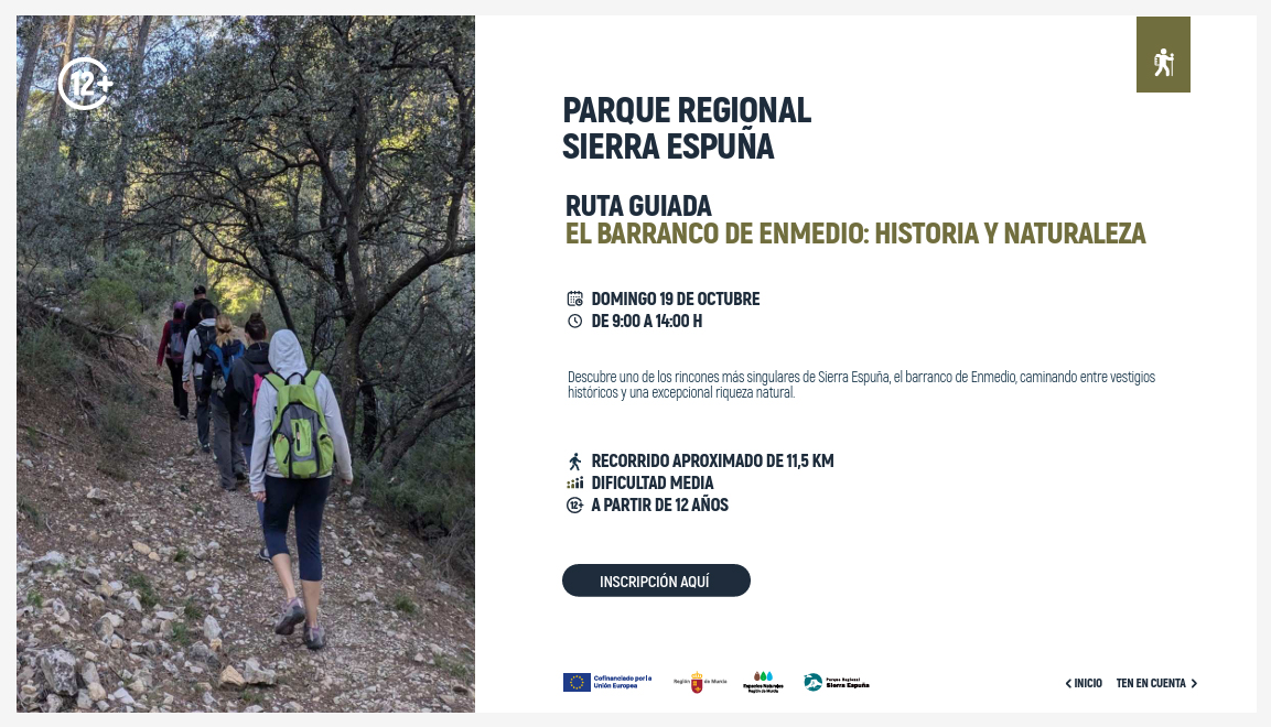 Actividad en que permite a los asistentes descubrir uno de los rincones más singulares de Sierra Espuña, el barranco de Enmedio, caminando entre vestigios históricos y una excepcional riqueza natural.