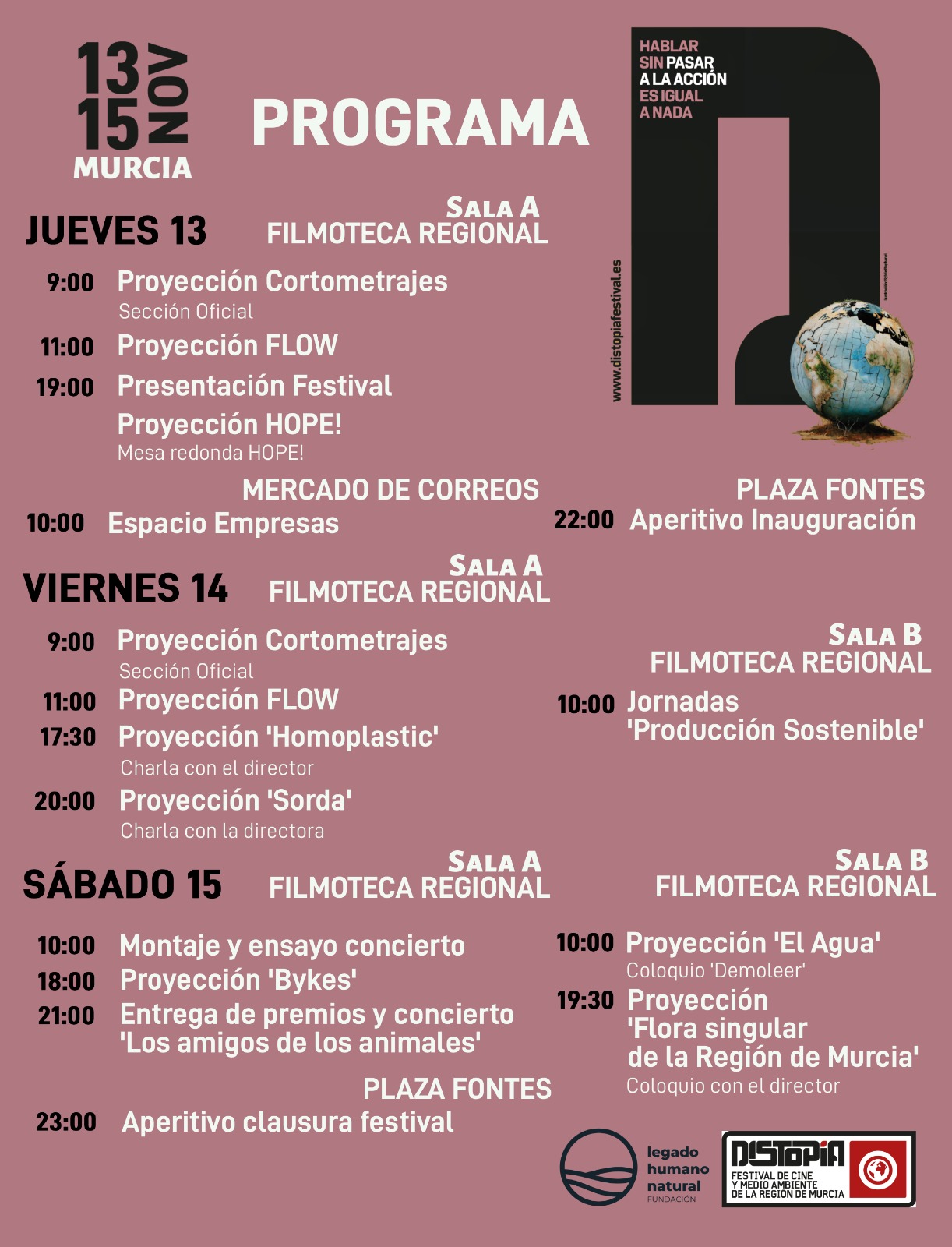 La Filmoteca Regional de Murcia acoge la tercera edición de 'Distopía, Festival de Cine y Medio Ambiente', que se celebra entre el 13 y el 15 de noviembre de 2025.