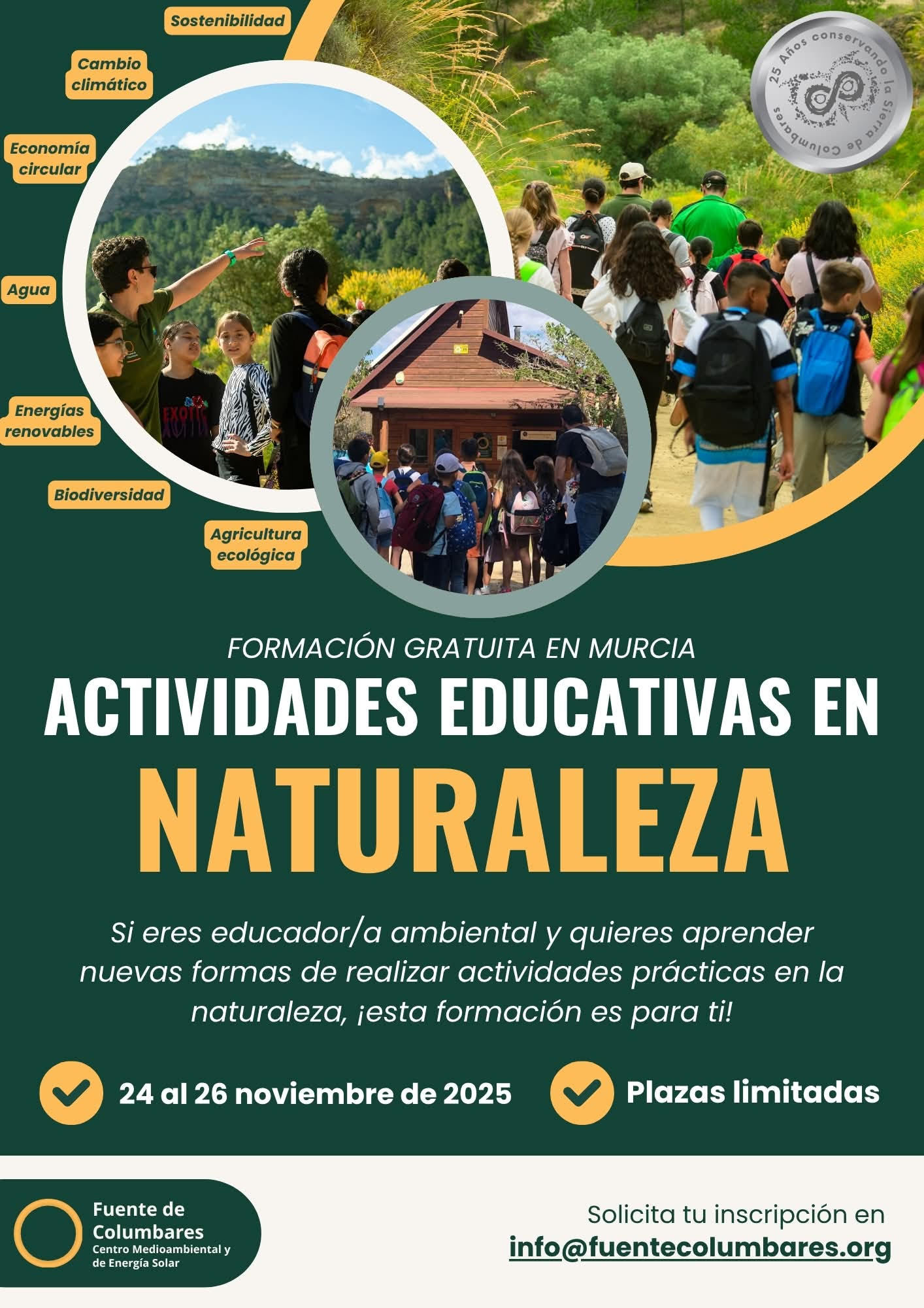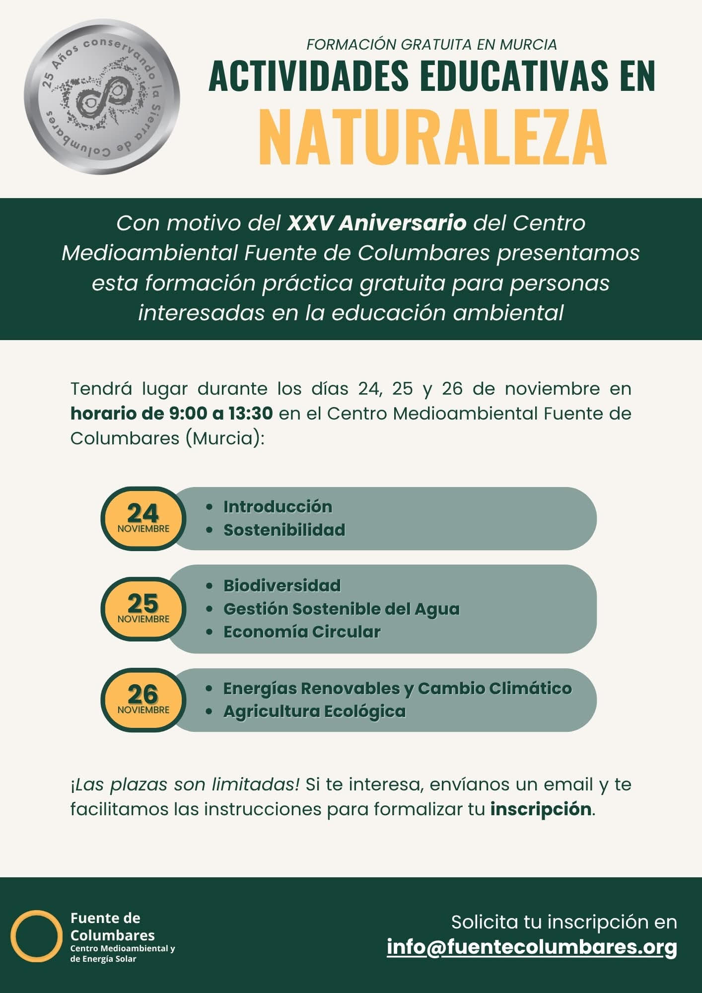 La formación formación es gratuita al coincidir con la celebración del 25º Aniversario de nuestro Centro Medioambiental Fuente de Columbares, pero las plazas son limitadas.