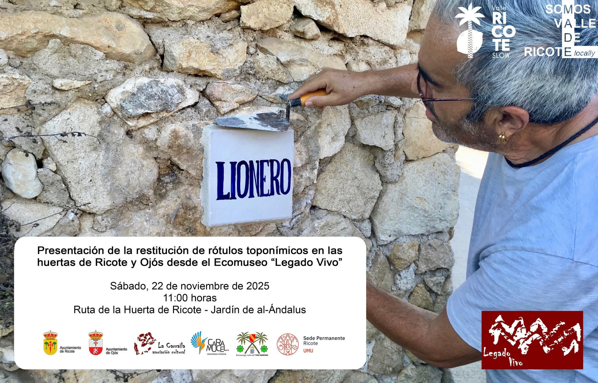 Presentación de la restitución de rótulos toponímicos en la huertas de Rictoe y Ojós dentro de la actuación de la iniciativa 'Vallenimia. Rotulación, recuperación y promoción de la toponimia del Valle de Ricote'.