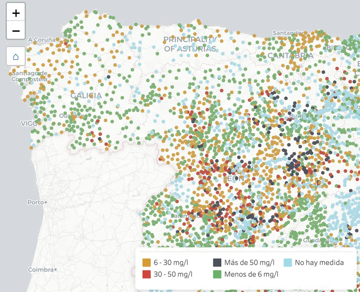 En 332 municipios donde se midieron los nitratos se superó el límite legal actual, y en otros 2.860, el límite propuesto por la ciencia para proteger de forma efectiva la salud de las personas. El mapa presenta una escala de colores del verde al negro,