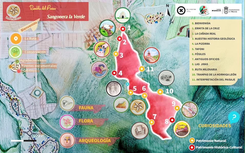 La Rambla del Pocico -o de Sangonera- se sitúa entre las pedanías murcianas de El Palmar y Sangonera la Verde, en el Parque Regional de El Valle y Carrascoy. Recoge las aguas de lluvia de la vertiente norte de la Sierra del Puerto de la Cadena, que traslada hasta el río Guadalentín. Adentrarse en este bello paisaje permite conocer una geología extraordinaria, diversidad de flora y fauna, fósiles, registros argáricos, edificios religiosos y usos tradicionales. Y todo ello, viene recogido en la Guía Didáctica Interactiva La Rambla del Pocico que invita a descubrir esta preciosa ruta.