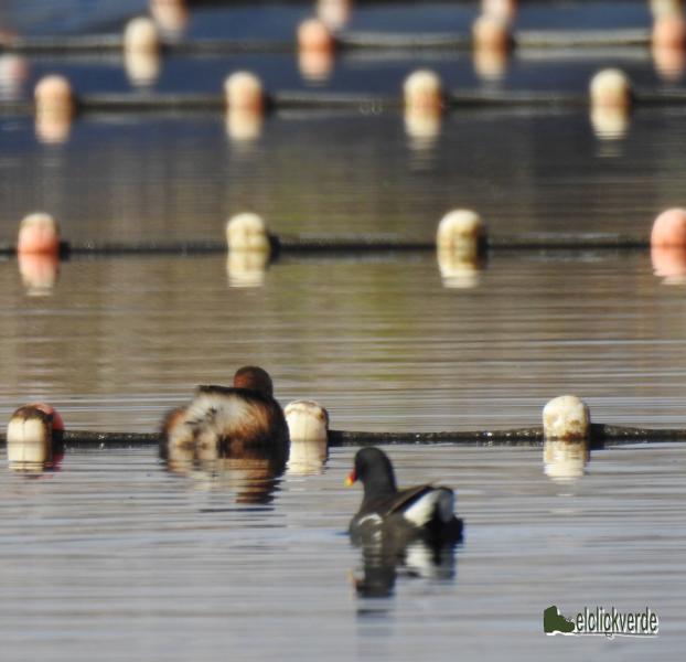 - Foto 2: Un zampullín de espaldas y una gallineta común comparten lámina de agua.