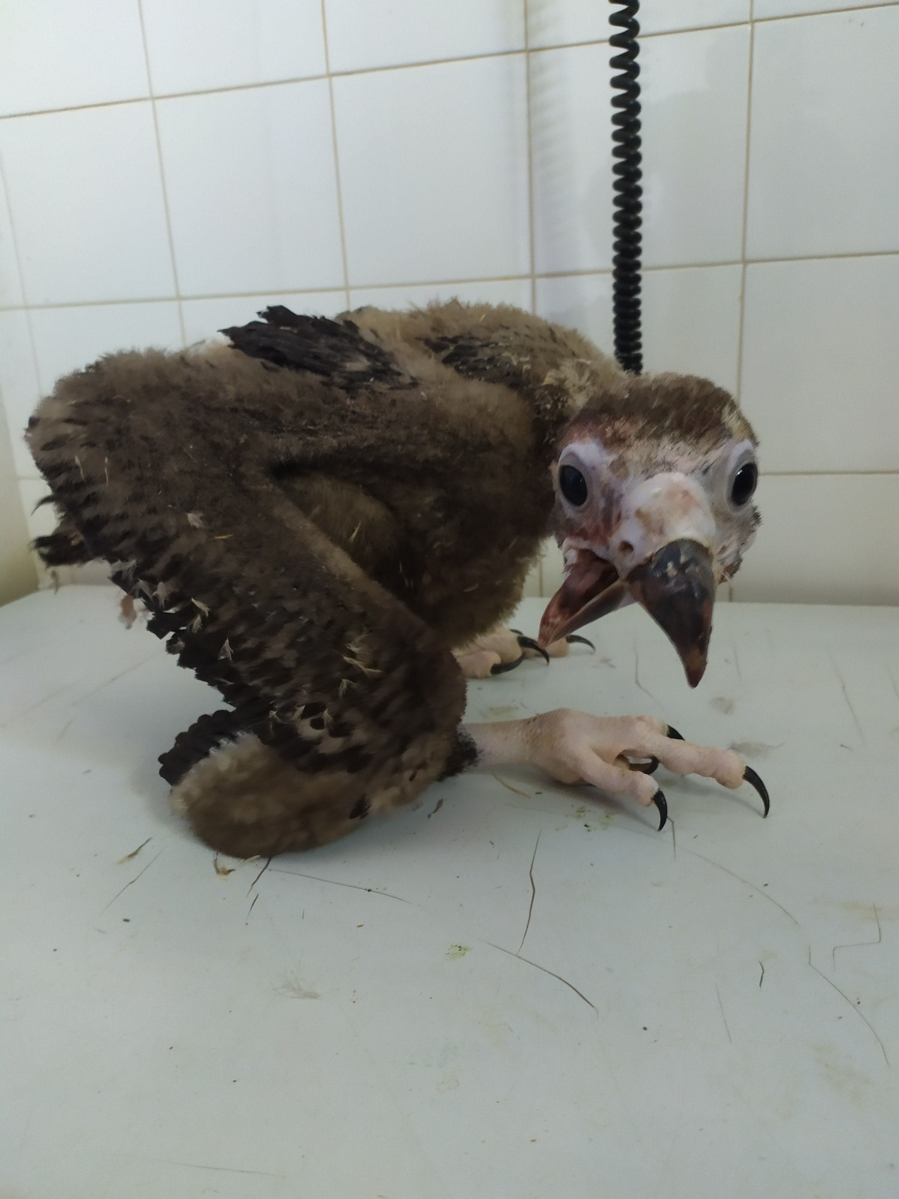 El impacto de la caída desde lo alto de un gran pino negro le causó heridas de gran importancia. El pico quedó totalmente desviado haciendo imposible que se alimentara por sí mismo. Fue trasladado de urgencia al hospital de AMUS, en Badajoz, donde le han practicado una novedosa maniobra ortopédica en aves salvajes. Su recuperación sirve a la ONG extremeña de ejemplo para mostrar "el valor de los centros de recuperación de fauna y su contribución al mantenimiento de la biodiversidad".