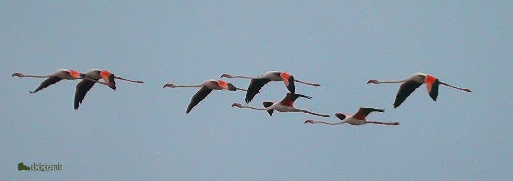 - 9- Un bando de flamencos -del tamaño habitual- cruza las salinas de San Pedro.