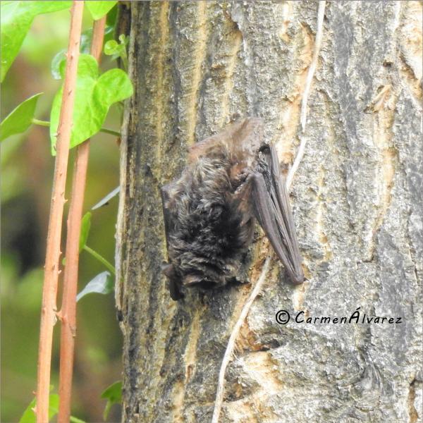 El feliz hallazgo lo realizó Carmen Álvarez Montalbán, en un paseo por las Fuentes del Marqués cuando a eso de la una del mediodía, e inesperadamente, vio sobrevolar lo que creía que era una pequeña ave negra. Su curiosidad y experiencia en pájaros le hizo mirarlo más detenidamente y comprobar que, para su asombro, se trataba de un pequeño murciélago. “Lo cierto es que nos ha sorprendido a esas horas, y volando tan al lado de nosotros”, comenta Álvarez. El animal, surgido no sabe de dónde, se fue a posar entre las ramas de un arbusto, en su posición habitual colgado boca abajo. Esta primera aparición duró menos de un minuto, el tiempo justo para echarle una fotografía con la que dejar constancia del encuentro, sin saber aún que se trataba de una cita muy especial. Por si no fuera suficiente, al poco, en un tramo más adelantado del río, de nuevo se presentó un murciélago igual, aunque no puede precisar si se trataba del mismo o de otro ejemplar. Como en la ocasión anterior, salió de la espesura y se posó en el tronco de un árbol, momento que de nuevo, y según su costumbre 'pajarera', aprovechó para sacarle una nueva imagen. Después, el quiróptero se dirigió al río y se paseó por la lámina del agua. “Me ha dado la impresión de que bebía, pero lo mismo estaba cazando algún mosquito”, describe la naturalista.