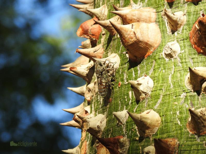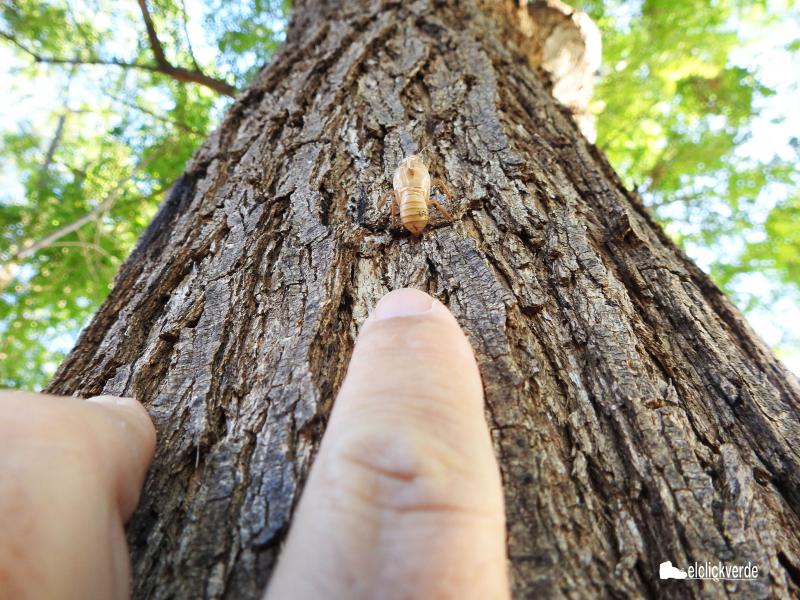 Dicen que es bastante difícil detectar a las chicharras en los troncos de los árboles debido al mimetismo de sus colores -su librea críptica-. Les dejo un truco: ahora que hay arbolado exótico de jardinería, miren ahí, su coloración es distinta y se distinguen mejor -no están adaptadas a estos colores y resultan menos crípticas, aprovéchenlo-; y otra forma: no duden en usar prismáticos, tanto los adultos como las mudas se aprecian perfectamente, tanto que al retirar los prismáticos se preguntarán cómo es que no las han visto a simple vista.