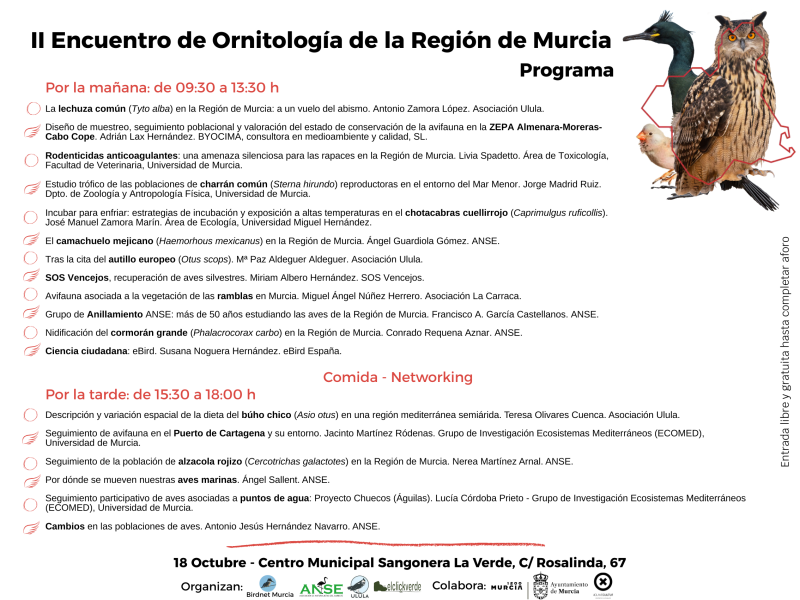 El Encuentro ha estado liderado por los naturalistas Susana Noguera Hernández, Antonio Jesús Hernández Navarro y elclickverde, con la participación de ANSE, Ulula y la red de información sobre avifauna Birdnet Murcia en la organización, y ha contado con la colaboración del Centro Municipal de Sangonera la Verde. Las comunicaciones que ayer se defendieron serán recogidas en un pdf que se pondrá a disposición online de los interesados.