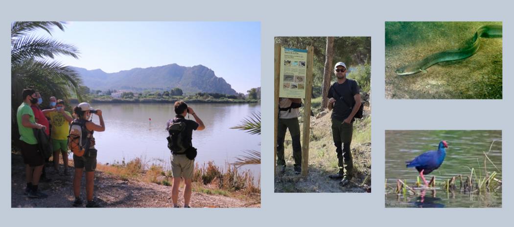 Visitantes en el Valle de Ricote, Héctor Quijada (centro), y fauna de la zona: una anguila arriba y un calamón abajo.