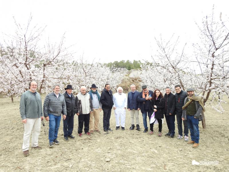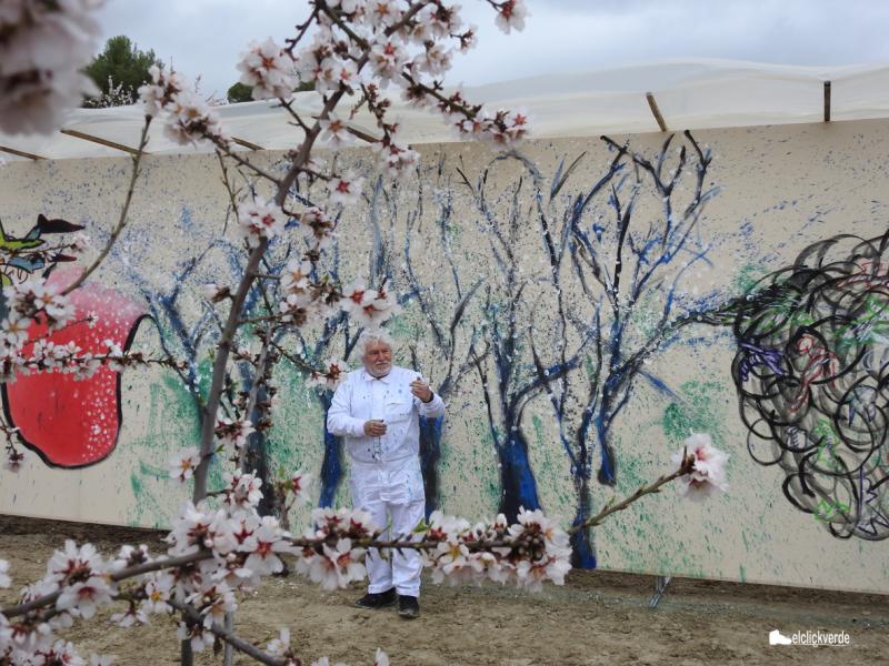 La mañana amaneció más fría de lo previsto este sábado en la pedanía de El Niño de Mula. De cuando en cuando, el viento desprendía los pétalos de los almendros y brillaban sobre sus flores las gotas de lluvia. En esa inesperada intemperie de barro que se aferraba a las botas, Cristóbal Gabarrón desplegó su intensidad pictórica para crear, sobre un gran lienzo, una obra que reuniera arte y naturaleza, biodiversidad y creación. Con ello, arrancaba su iniciativa artística bautizada como 'Ámbito' que recalará en varios enclaves naturales de todo el planeta y que inauguraba los actos de conmemoración del 30 aniversario de la Fundación Gabarrón. Quiso el artista internacional rodearse para ello de amantes de ambas disciplinas. Y entre pintura, poesía, música y danza, convocó también al conocido naturalista Joaquín Araújo, un mago de la palabra y el sentimiento.