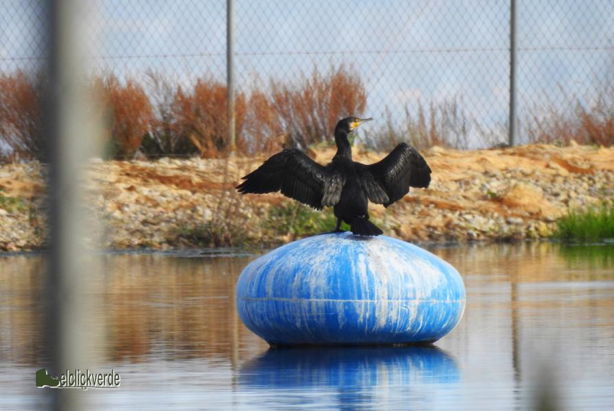 - Foto 1 (Arriba): un cormorán grande se seca las alas sobre una boya, en una charca agrícola.
