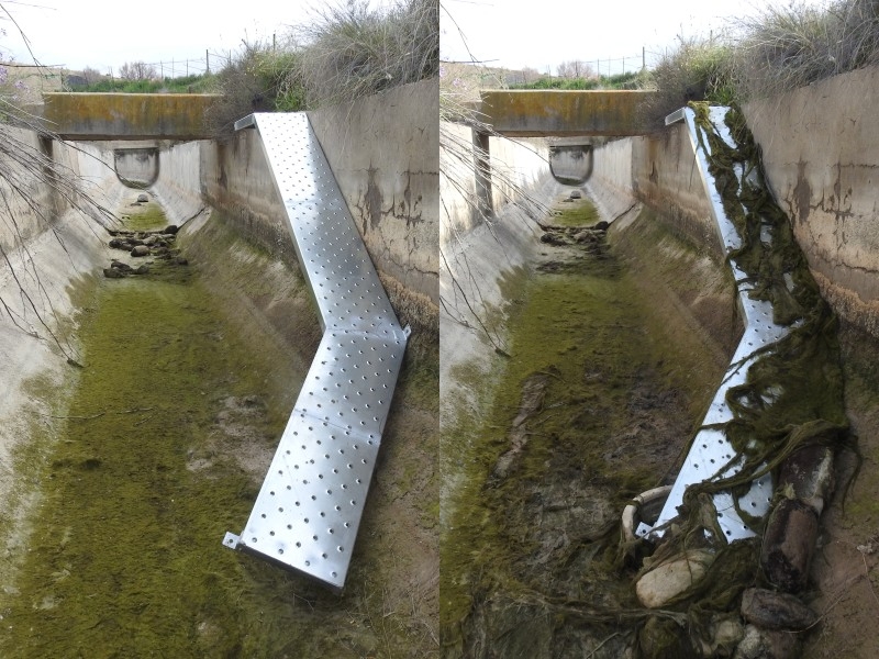 Rampa de salida instalada y adecentada en el Canal Aguas Claras (Lorca, Región de Murcia) por el Poryecto Rampas Salvavidas. Imagen: cortesía de Conrado Requena.