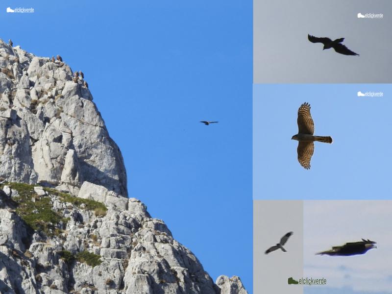 Cinco de las aves que pudimos ver en el macizo: buitres leonados, quebrantahuesos, gavilán hembra, aguilucho pálido y águila real (extractos de vídeo).