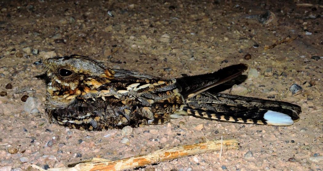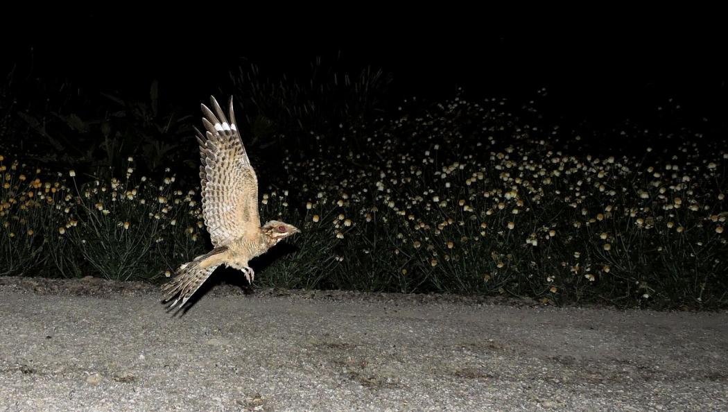 Macho adulto de chotacabras, alzando el vuelo desde el suelo en la noche. Imagen: Proyecto Chotacabras.