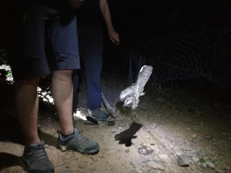 Hoy, de hecho, una vez puestas las redes, el equipo ha capturado a una pareja de adultos. De las dos redes instaladas esta tarde, solo una ha funcionado. Suele ocurrir. El lapso intermedio se ha invertido en la búsqueda de nuevos nidos, mientras decenas de conejos, sin exagerar, cruzan el campo caóticos y despavoridos, unos para un lado, otros para el contrario, y dos gatos negros, una de las más graves amenazas domésticas del chotacabras, nos miran desafiantes, lentos y panzudos, a lo lejos, al final del camino.