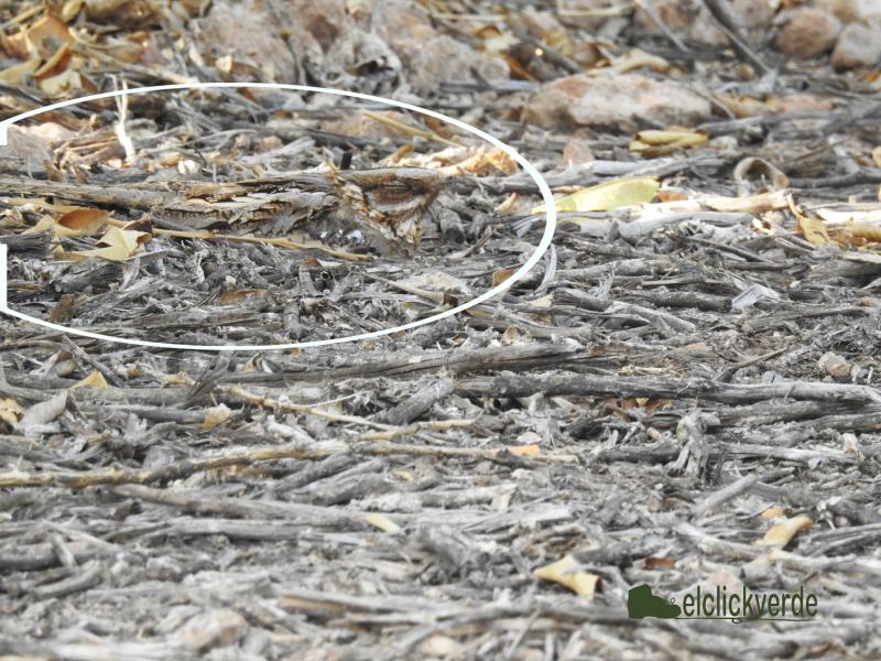 La misma imagen, arriba sin pistas y abajo con la localización del chotacbras resaltada para que sea más fácil su identificación.