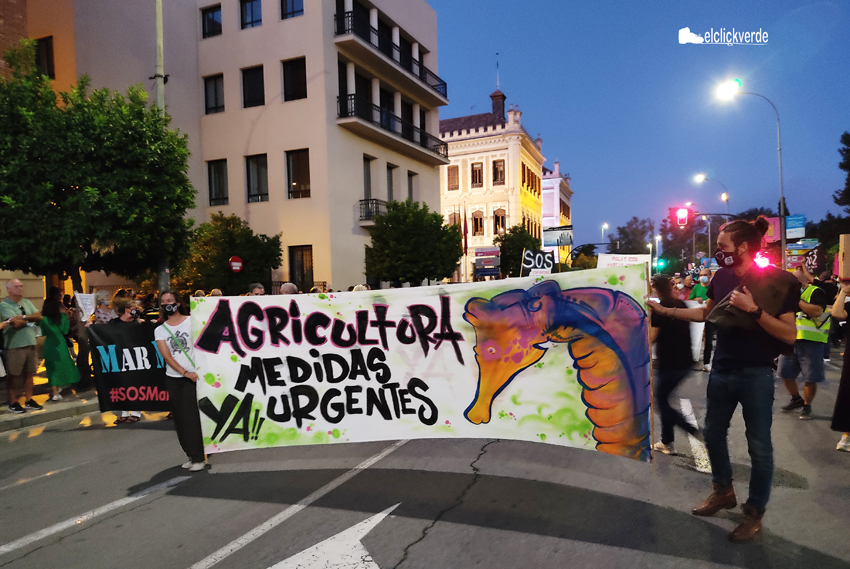 La cabecera de la manifestación salió desde la Delegación del Gobierno, con una pancarta sostenida por los portavoces de cada una de las organizaciones convocantes que rezaba 'S.O.S. Mar Menor. Por un Mar Menor con futuro'. Antes del inicio de la misma más de un millar de personas esperaban en los alrededores. Una segunda columna arrancó desde la sede del Gobierno regional, y ambas se encontraron en la Gran Vía para encarar el tramo final hacia la Consejería de Agua, Agricultura, Ganadería, Pesca y Medio Ambiente, de la que dependen la mayoría de competencias necesarias para poner remedio a la crisis ecológica de la laguna, según explica la organización.