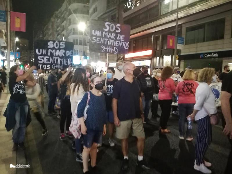Isabel Rubio, una de las caras más visibles de la plataforma ciudadana Pacto por el Mar Menor -una de las entidades convocantes- y un símbolo ya en la lucha por la laguna litoral, fue la encargada de leer el manifiesto, en el que repasó las veces que desde el Gobierno regional se ha negado su mal estado, siendo en varias ocasiones aplaudida con profusión. Así ocurrió cuando señaló: "Pedimos al Gobierno del Estado que no conceda las competencias de Costas a un Gobierno que acabó con la Ley del Mar Menor de 1987", o cuando se exigió que el Gobierno regional y la Confederación Hidrográfica del Segura desmantelen los regadíos ilegales, "esos que decían que no existían". La organización solicitaba también en el escrito "un comité de participación no manipulado por la Comunidad Autónoma" y exigía, de nuevo entre la aclamación del público, "que los responsables de este desastre dejen a otros que hagan el trabajo que venimos pidiendo. No vamos a permitir que el Mar Menor se muera. No pararemos hasta que se cumplan las leyes, hasta volver a tener un Mar Menor vivo".